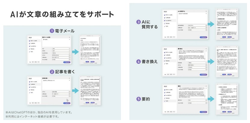 AIが文章の組み立てを支援。校正・要約・翻訳・メール作成・記事作成を補助する。