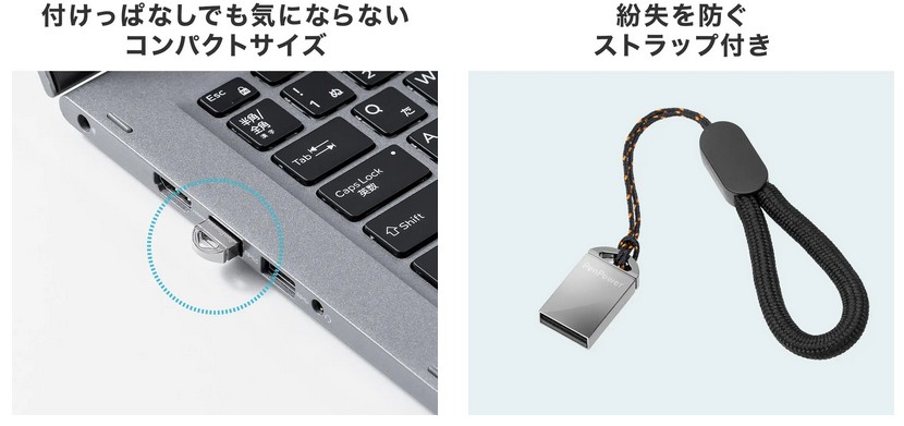 付けっぱなしでも邪魔にならない超コンパクトサイズのUSBドングル。紛失を防ぐストラップも付属する。