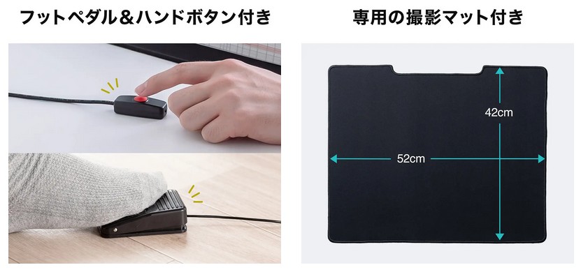 本体には操作パネルを搭載し、静止画・動画の切替や拡大縮小も直感的に操作できる。さらに手元シャッターやフットペダルが付属しており、本を押さえながらでも両手を使わずに撮影できるのが魅力。ユーザーの使いやすさに徹底的にこだわった設計だ。