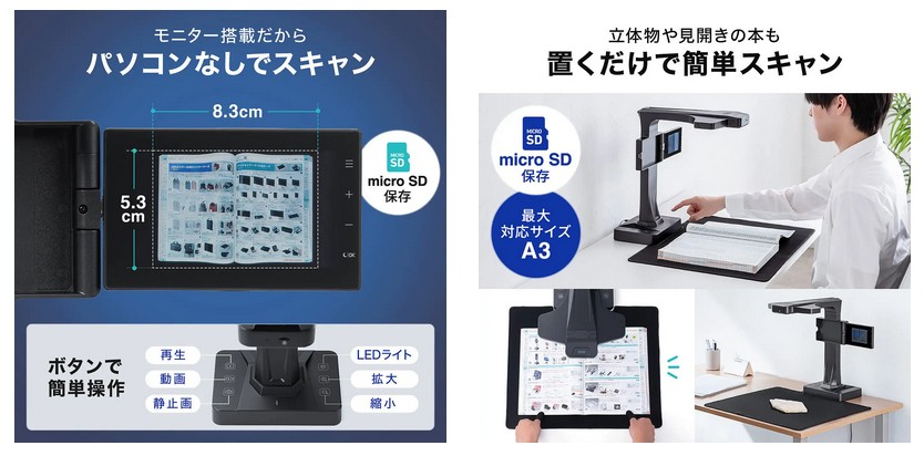 ■モニター搭載でパソコン不要、最大A3サイズまで対応可能なドキュメントスキャナー「400-SCN070」