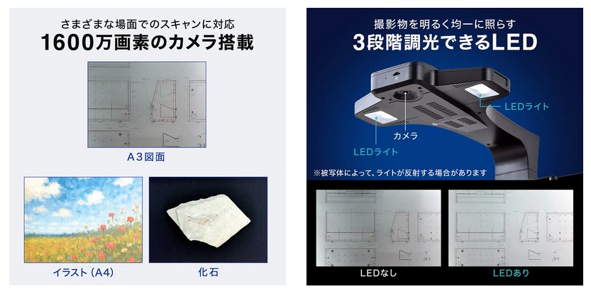 1600万画素CMOSセンサーを搭載し、細部までくっきりとしたスキャンが可能だ。文字はもちろん、写真や細かな図面も高精度にデータ化。さらにLEDライトは3段階調光が可能で、環境に合わせて最適な明るさを選択でき、安定した撮影環境を実現する。
