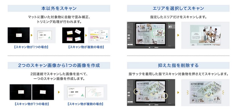 書籍の見開きページや大きな図面、立体物まで置くだけでスキャンできる。専用マットの範囲に収めるだけで、歪みの少ない鮮明な画像を取得できる。業務資料や教育教材の電子化、クリエイティブ作業のアーカイブなど、多彩なシーンで活用できる。