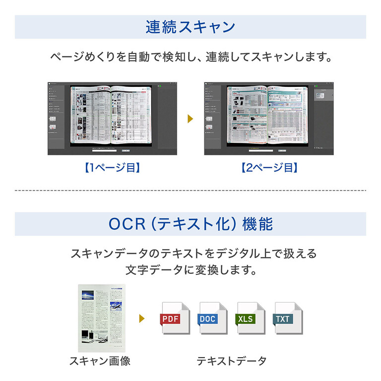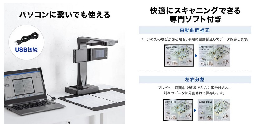 液晶モニターを搭載しているため、スキャンからデータ保存までパソコン不要で操作できる。すぐにデータ化して共有できるため、効率的な業務をサポートする。もちろんパソコンに繋いでも使える。専用ソフトをインストールすることで多彩な機能でスキャンできる。撮影した本の曲面を補正したり、写り込んだ指を削除したり、文書のOCR機能などは専用ソフトで使える。