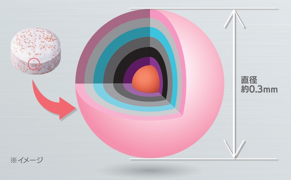 7 層構造の腸溶性細粒を直径約0.3mm まで小さくすることで、有効成分ランソプラゾールが胃酸の影響を受けることなく速やかに届く※6 とともに、飲んだ時の苦みやざらつき感を抑えている。