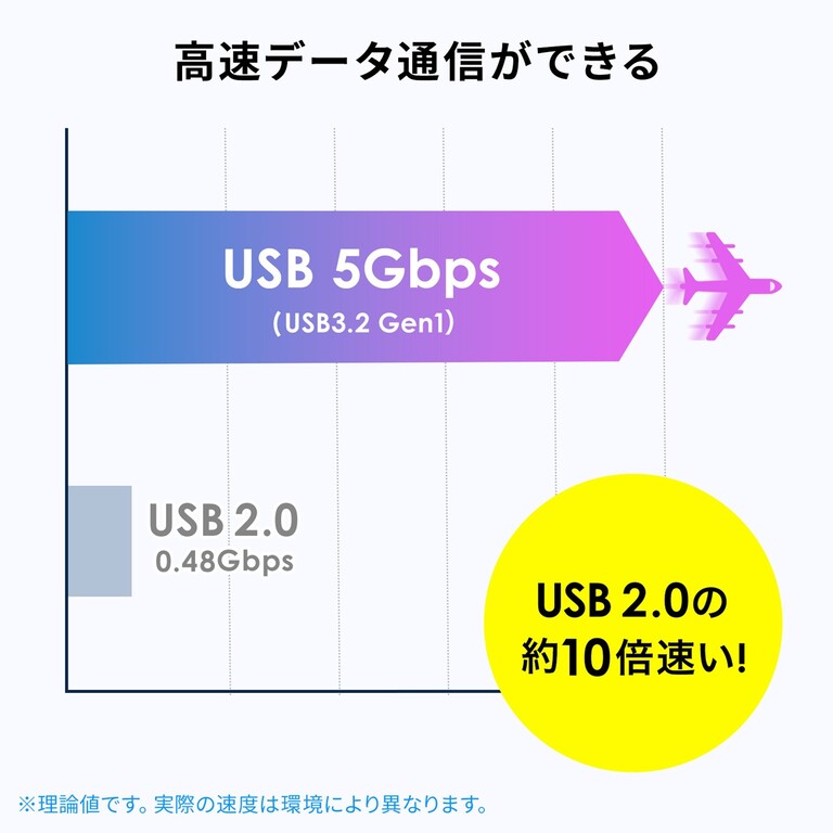 USB 5Gbpsの高速データ通信対応。※理論値。実際の速度は環境により異なる。