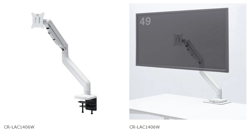 サンワサプライ株式会社は、高耐荷重のガススプリング式モニターアーム「CR-LAC1406BK(ブラック)」「CR-LAC1406W(ホワイト)」を発売した。最大20kg対応の堅牢設計とスムーズな高さ・角度調整機構で、49型までの大型ディスプレイを自在にセッティングできます。デスク面をしっかり守る補強プレート付きで、ぐらつきを防ぎ、安定感のある設置が可能だ。