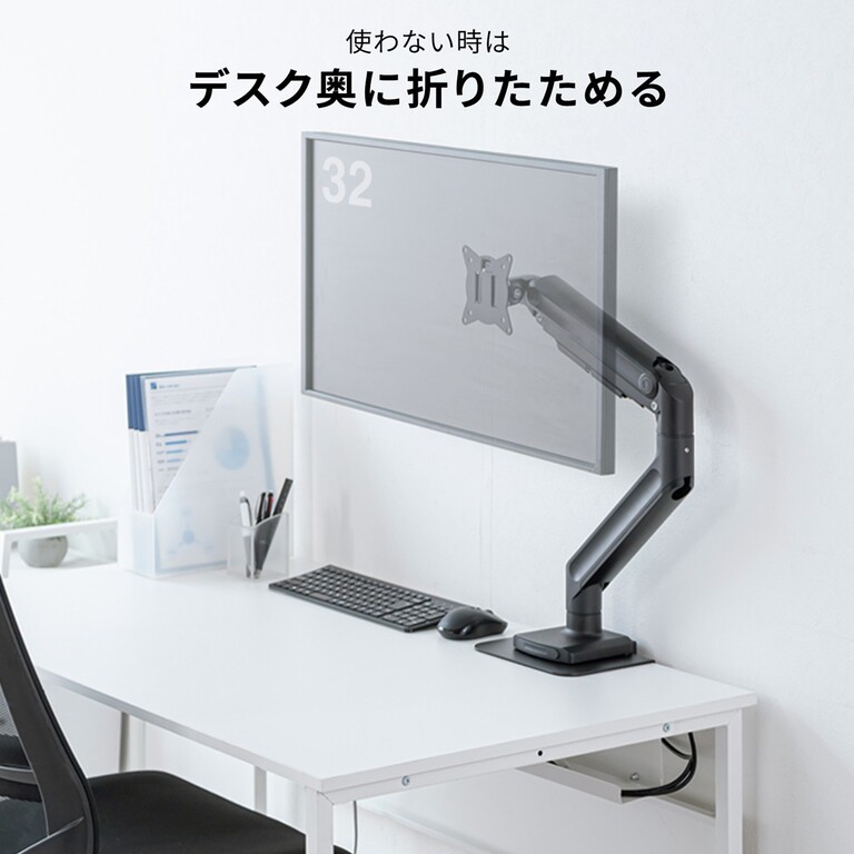 モニターの台座を必要としないので、デスクの上を広く使うことができる。