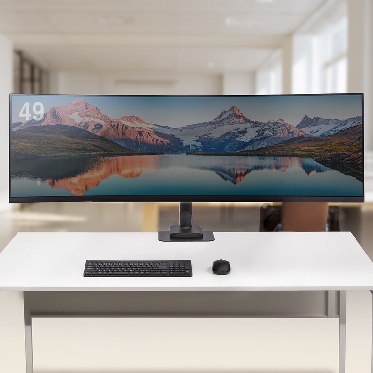 最大49インチまでのモニターを取り付け可能で、ワイドモニターも設置できる。