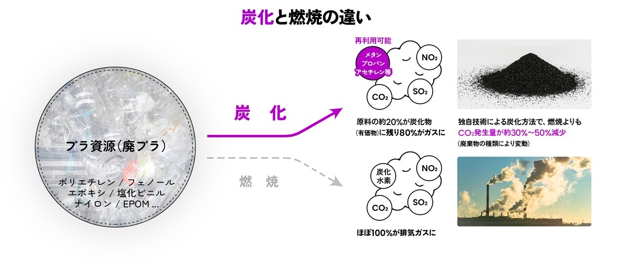 炭化とは、廃棄物(Garbage)などの有機物を無酸素で加熱し、熱分解する処理⽅法。炭化は、燃焼(焼却)のように酸素を⼤量に使⽤しないため、CO₂排出量を約 30〜50%(入口の廃棄物の種類によって変動)抑えながら「炭化物(Carbon)」を生成することができる。処理された廃棄物のおよそ80%は熱エネルギーに、残り20%は炭化物(PETの場合)として固形資源化される。