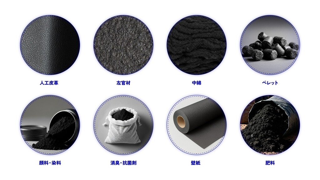 炭の粉末は黒⾊顔料としての汎用性に加え、消臭・抗菌・遠⾚外線効果などの機能も備え、用途に応じて⼈⼯⽪⾰や建材、繊維など幅広い高付加価値素材へと展開が可能。.Garbonによって、企業や自治体は廃棄物量・CO₂排出量・費⽤の削減と同時に、資源循環率の向上や新たな収益創出を実現することができる。