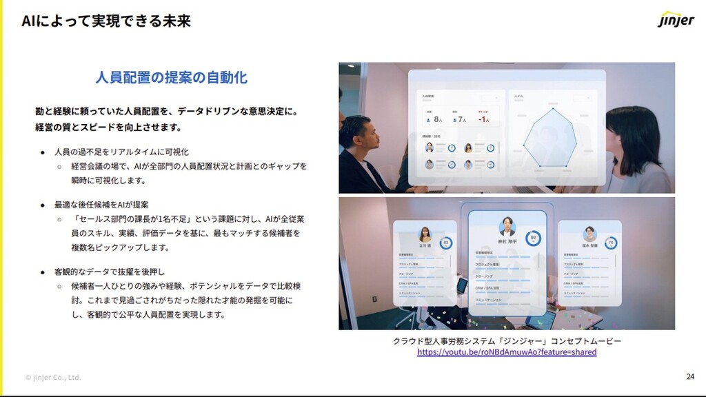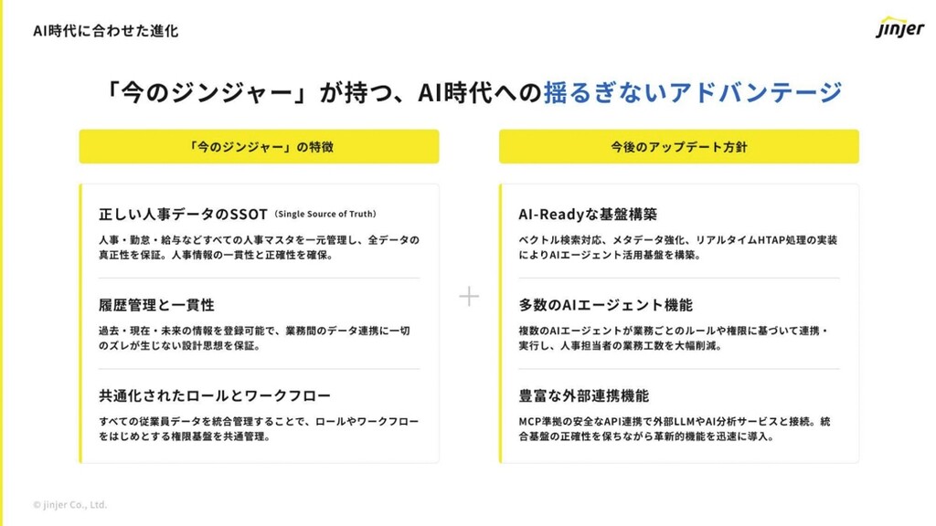 そうした背景を踏まえ、クラウド型人事労務システム「ジンジャー」を提供している同社は、はこれまで培ってきた人事業務のナレッジを活用しつつ、さらなる人事業務の水準向上を目指し、AIエージェントと技術トレンドの変化を踏まえたAI構想を掲げる。特に「人的資本経営」でも重要となるタレントマネジメントと人的資本リスクマネジメントを行い、人的資本の可能性の最大化を狙う。