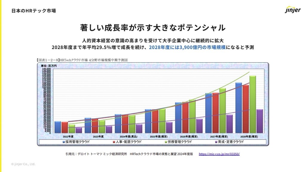 日本のHRテック市場について、冨永氏は「著しい成長率が示す大きなポテンシャル」があり「人的資本経営の意識の高まりを受けて大手企業中心に継続的に拡大。2028年まで年平均29.5%増で成長を続け、2028年度には3,900億円の市場規模になる」という予測を紹介した。