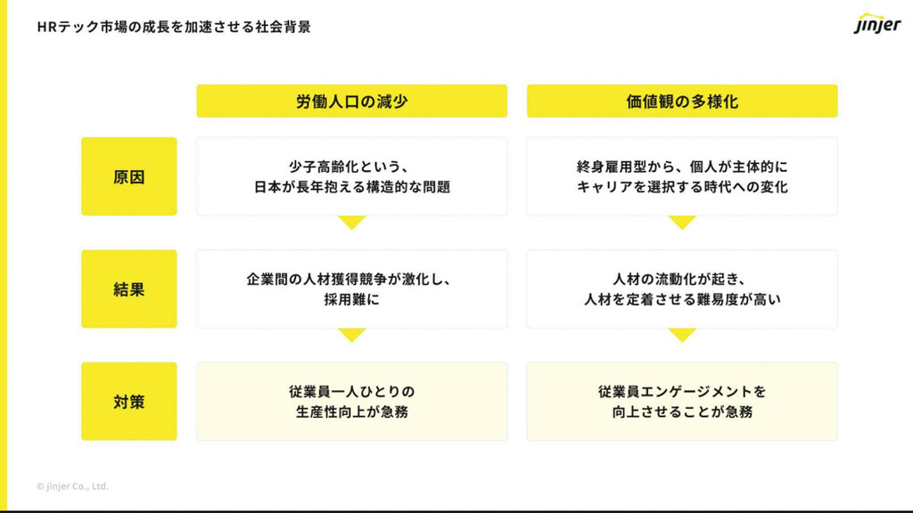 このようなHRテック市場の成長を加速させる社会背景としては、「労働人口の減少」と「価値観の多様性」を挙げた。労働人口の問題への対策に「従業員一人ひとりの生産性向上が急務」であり、価値観の多様化の対策には「従業員エンゲージメントを向上させることが急務」であり、そのため成長が加速しているという見解を示した。