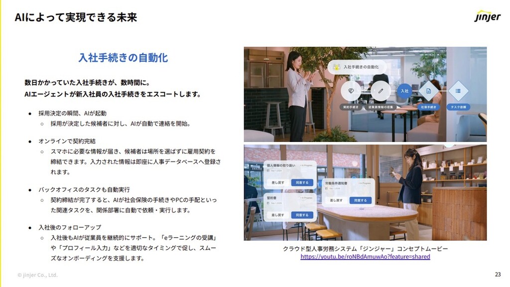 AIによって実現できる未来のあり方としては、二つの具体例が語られた。一つ目は「入社手続きの自動化」で、AIエージェントが新入社員の入社手続きをエスコートし、従来数日かかっていた入社手続きが、数時間で完結するというもの。