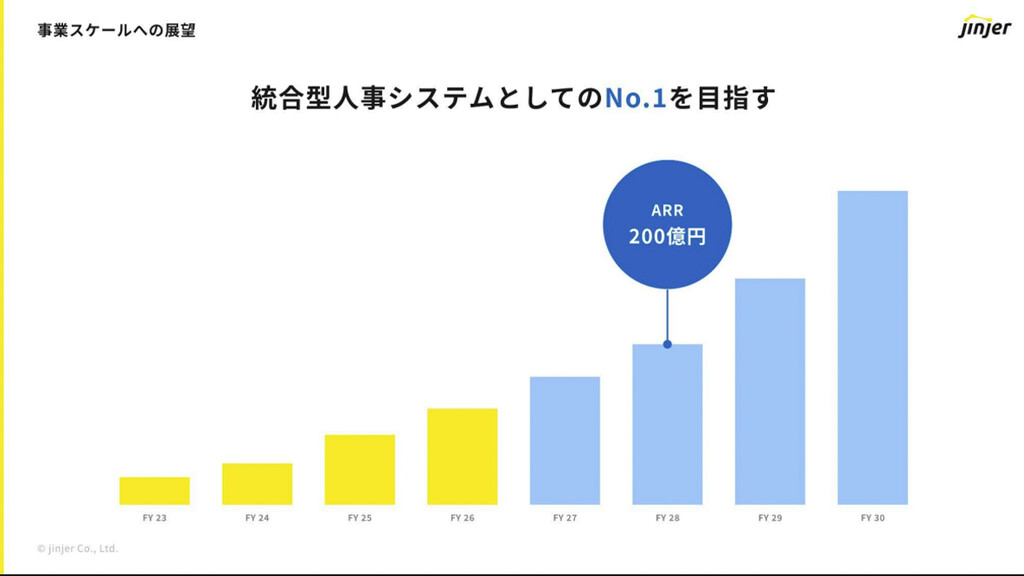 また、「ジンジャー」は統合型人事システムとしてのNo.1を目指す、と宣言した。No.1になるための戦略も立てていると話し、28年にはARR(年間収益)200億円という目標を掲げた。