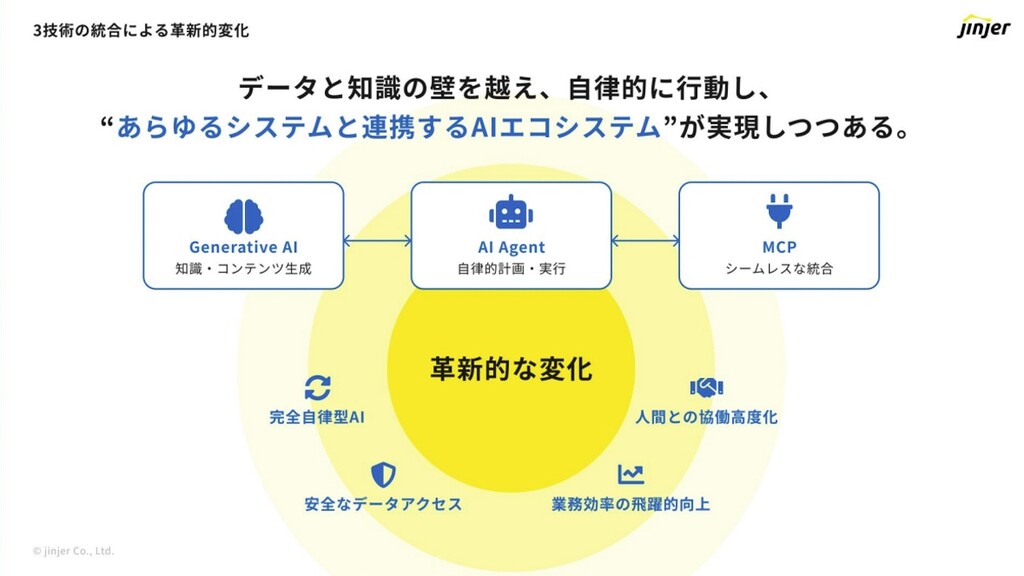 「ジンジャー」において、今後は知識・コンテンツ生成の「生成AI」、自律的計画・実行の「AIエージェント」、AIエージェント同士のシームレスな統合を可能とする「MCP」を活用していく、とした。