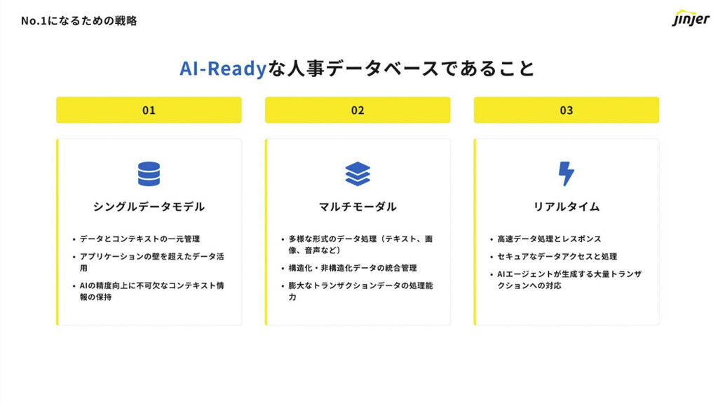 また「AI-Readyな人事データベースであること」に必要な3つの要素として、データとコンテキストの一元管理などの「シングルデータモデル」、テキスト・画像・音声といった多様な形式のデータ処理ができる「マルチモーダル」、高速データ処理とレスポンスによる「リアルタイム」が挙げられた。