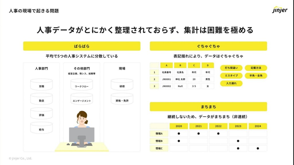 ただ、これらのツールによって一部の問題は解決するものの、また新たな問題が生じてくるという。その問題とは、たとえばA社に所属する「田中太郎」さんは一人だが、ツールごとに「田中太郎」さんのデータがバラバラに存在し、社員番号、社員名(漢字)、年齢などが表記揺れによってごちゃ混ぜになり、非連続なデータはまちまちになっている、というものだ。