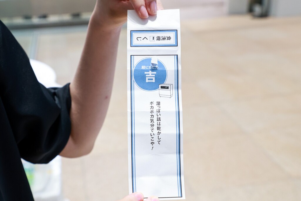 お皿の洗浄を終えると、簡単なアンケートに答えた後、巨大ガチャを引くことができた。カプセルの中にはおみくじとお菓子が入っており、運試しとちょっとしたご褒美を楽しめる仕掛けだ。今回のおみくじの結果は「吉」。そこには「湿っぽい話は乾かして ポカポカ気分でいこや!」と、大阪弁でモヤモヤを吹き飛ばすような言葉が記されていた。