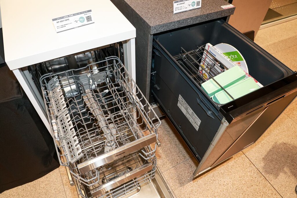 そのほか、約5人分の食器を一度に洗える「NP-TZ500」も展示されていた。液体洗剤自動投入機能やおまかせコースを搭載し、家族の食器をたっぷり洗える便利なレギュラータイプだ。さらに、スリムになった「NP-TSK1」も登場。奥行わずか約29cmながら、約4人分の食器を洗うことができる。