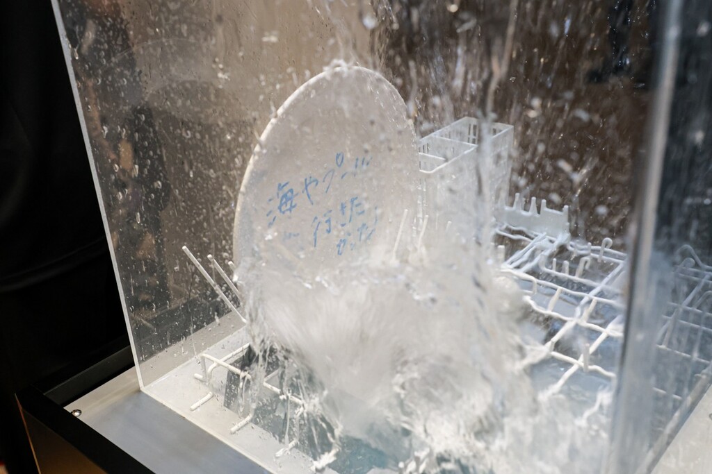 今回、実際にイベントを体験できたので、その様子をお伝えする。まず、用意されたお皿にサインペンで「モヤモヤ」などを書き込む。普段はお皿に文字を書くことなどないため、新鮮で少し不思議な体験だ。書き終えたお皿を、透明ガラスで中が見える特製食洗機へ持っていくと、スタッフが丁寧にセットし、洗浄を開始してくれた。すると、始まってすぐに文字は薄れていき、わずか5秒ほどで跡形もなく消えた。普段は目にすることのない食洗機内部の様子を直に見られ、その高い洗浄力に驚かされた。