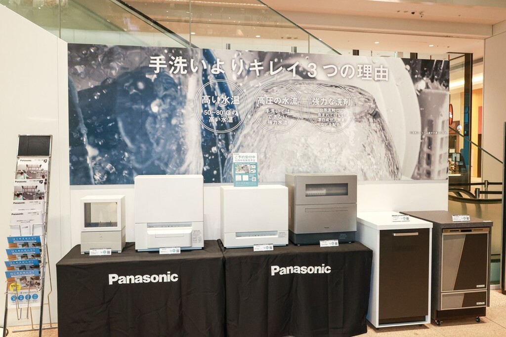 さらに会場には、さまざまなタイプの食洗機が展示されていた。通常、食洗機を使うには分岐水栓の工事が必要だが、約1人分の食器を洗うのにちょうどいい「SOLATA(NP-TML1)」はタンク式のため、分岐水栓の取り付けが不要。前面と背面がガラス仕様で、インテリアにもなじむデザインとなっている。工事不要で手軽に使えることから、学生の一人暮らしにもぴったりの食洗機といえる。