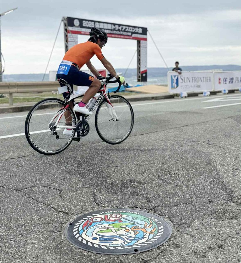 そして今回、佐渡国際トライアスロン大会との連携により、弊社としては初となるオリジナルデザインマンホールを設置した。