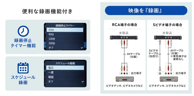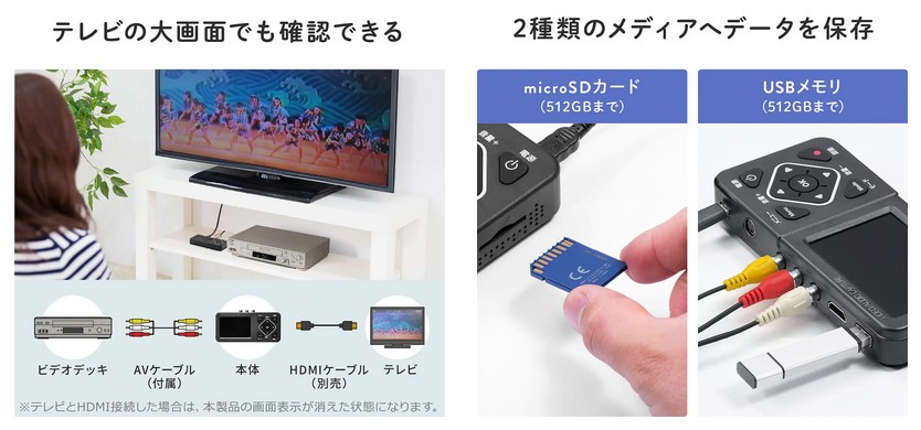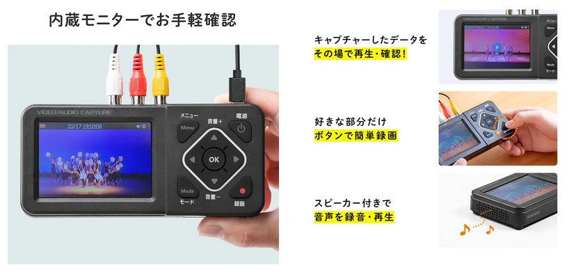 本製品とビデオデッキをRCAケーブル(赤 白 黄)で接続するだけで誰でも簡単に使用できる。モニター付きのため、テレビやパソコンがない環境下でもキャプチャーを行える。