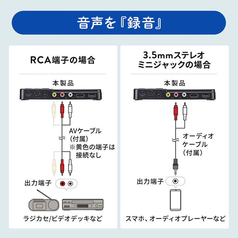 映像だけでなく音声データのみの録音にも対応。カセットテープやオーディオ機器の音声を、MP3やWAV形式で保存できる。懐かしいラジオ番組や音声メッセージも高音質でデジタル化でき、音楽ファンにもおすすめだ。