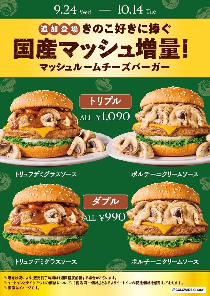 コロワイドグループの株式会社フレッシュネスは、2025年9月24日(水)より、ハンバーガーチェーン「フレッシュネスバーガー」にて、秋限定メニュー「マッシュルームチーズバーガー」シリーズに、国産マッシュルームの使用量を増量した新商品「トリプルマッシュルームチーズバーガー」「ダブルマッシュルームチーズバーガー」を追加発売する。