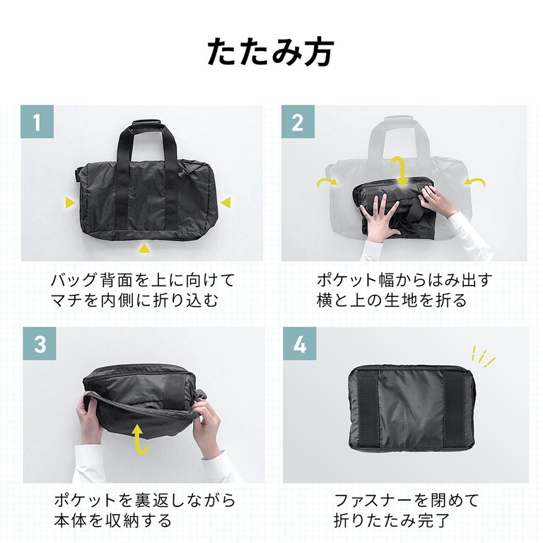 ■使うときは大容量、使わない時はコンパクトに折りたためる2WAY折りたたみボストンバッグ「200-BAGBP036BK」