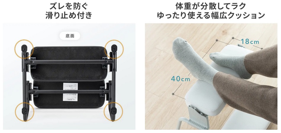 底面には滑り止めを搭載し、使用中にズレにくい設計。安心して足を預けられる安定感がある。オフィスでも自宅でも快適に使え、日常的に取り入れやすいのが魅力だ。
