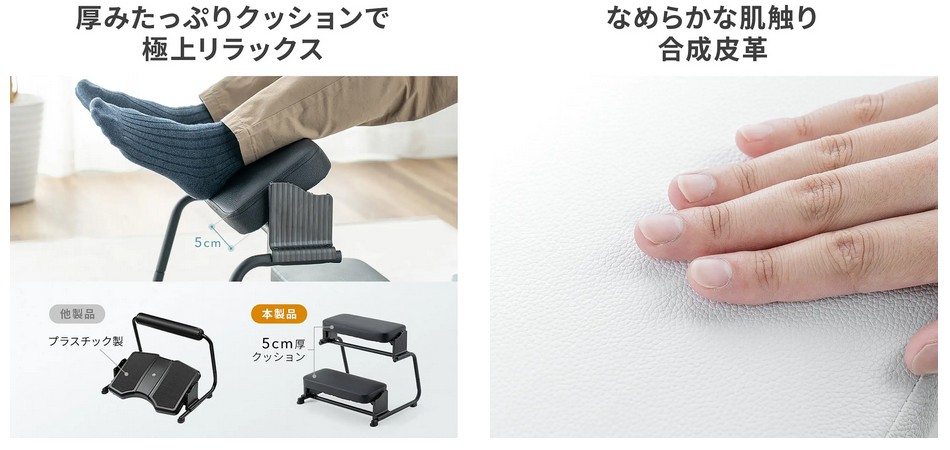 約5cmの極厚クッションを採用し、長時間使用しても疲れにくい設計だ。やわらかな合成皮革のカバーは肌触りも心地よく、デスク下でのリラックスをサポートする。