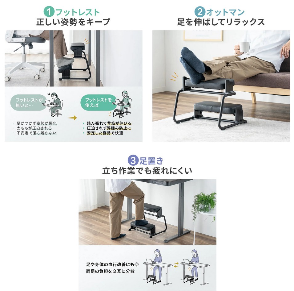 フットレスト・オットマン・足置きの3WAY仕様。リモートワーク中のデスクワークやリラックスタイム、スタンディングデスク使用時にも活躍します。シーンを選ばず、快適だ。