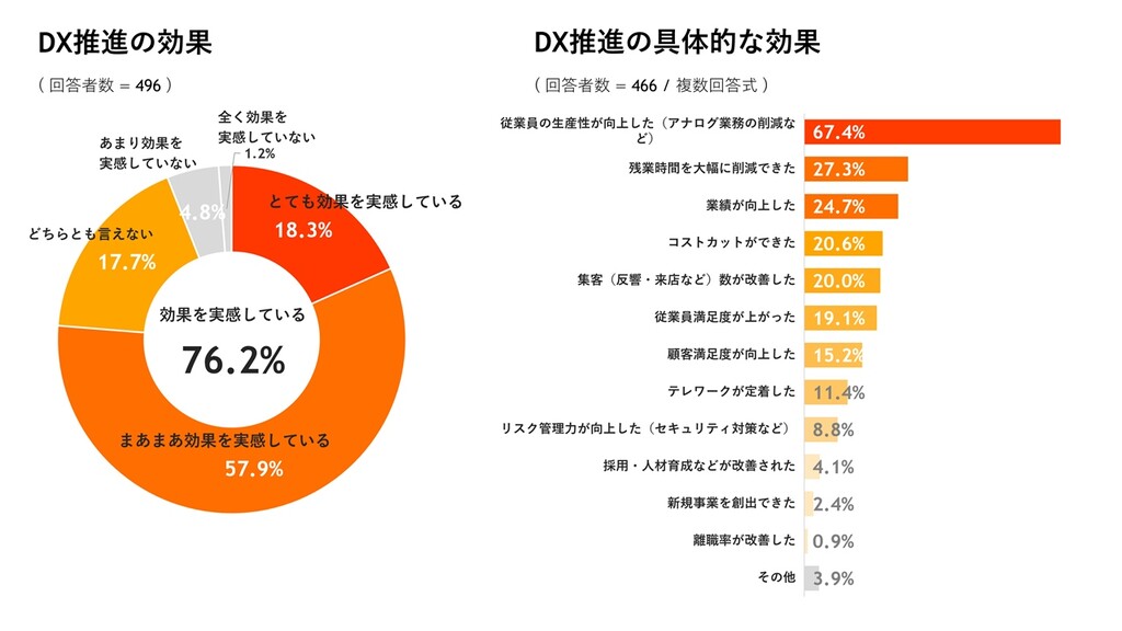 ■76.2%がDX推進の効果を得ていると回答。得られた効果の上位は「従業員の生産性向上」「残業時間の削減」「業績の向上」