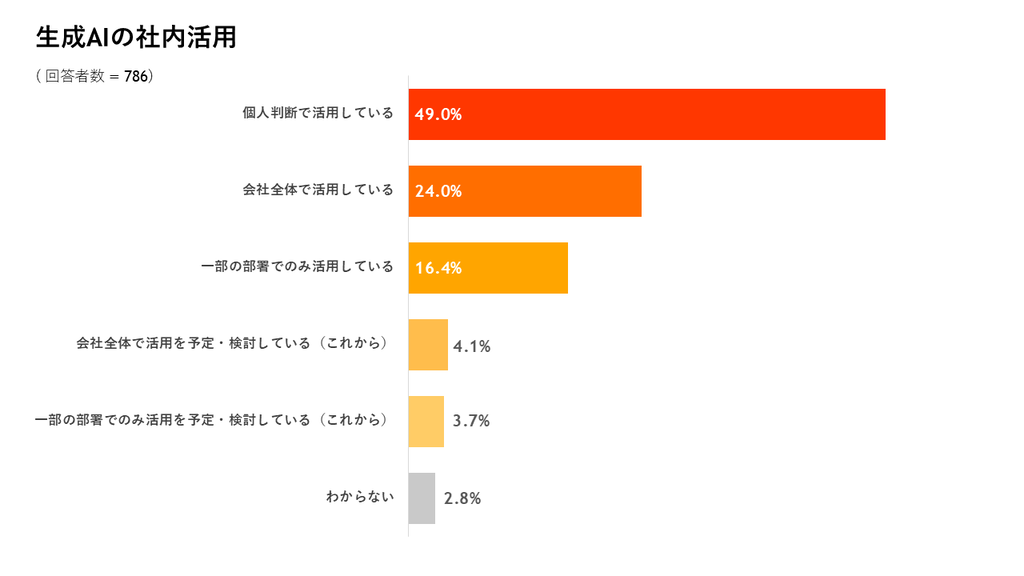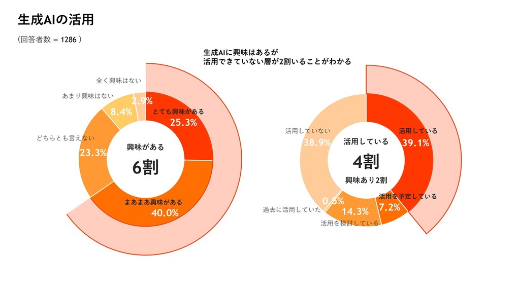 生成AIの活用に関しては65.3%が興味があると回答。所属する会社・部署ではどの範囲で生成AIを活用しているかの質問に対し、約半数となる49%が個人判断で活用、会社全体での活用は24%にとどまった。一方で、現在活用しているかという質問に「活用している / 活用予定」と答えたのは46.3%と、「興味はあるが活用できていない層」が2割ほどいることが分かった。