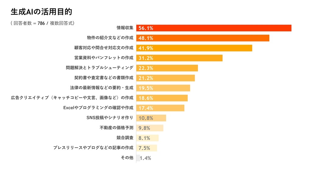 活用 / 予定 / 検討、過去に活用していた生成AIについて聞くと「ChatGPT」が85.5%と昨年に続き最多だった一方、「Gemini」が昨年10.6%から約4倍の38.8%に増加。生成AIの使い分けや多様化も進んでいることが分かった。また、生成AIの活用方法について聞くと、過半数である56.1%が「情報収集」に活用していることが分かった。さらに「物件の紹介文などの作成」は48.1%、「顧客対応や問合せ対応文の作成」は41.9%など、主に文章作成で生成AIを活用していることが分かった。