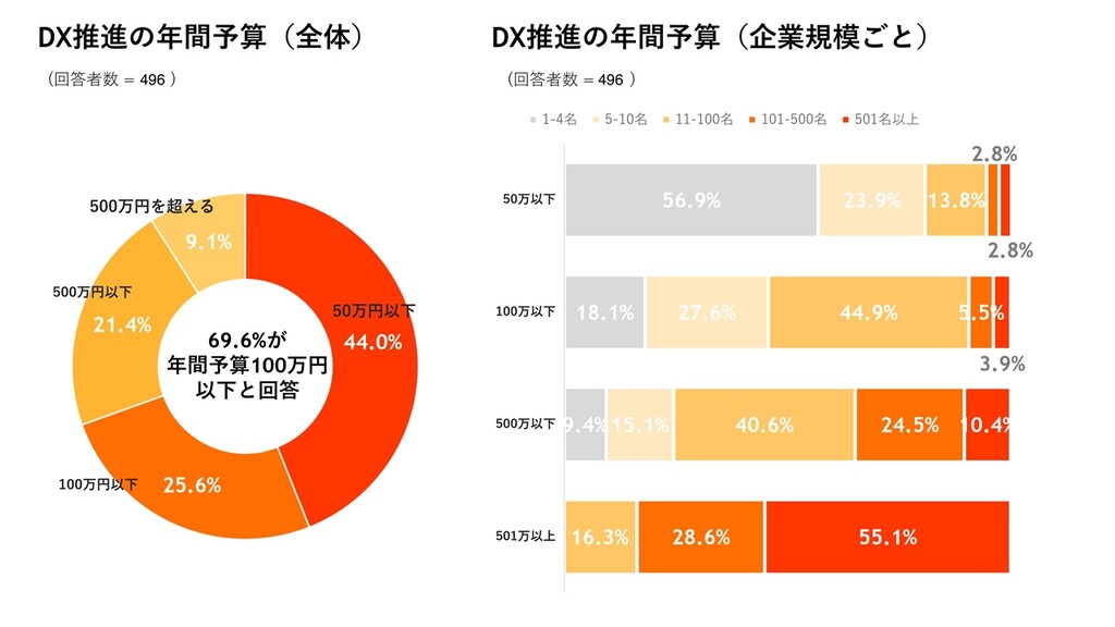 DX推進における年間予算は69.6%が100万円以下と回答。さらに予算ごとで区切ると、50万円以下と回答した人のうち従業員10名以下の企業が80.8%、501万以上と回答した人ののうち従業員101人以上の企業が83.7%と、会社規模によって年間予算に直結していることが分かった。