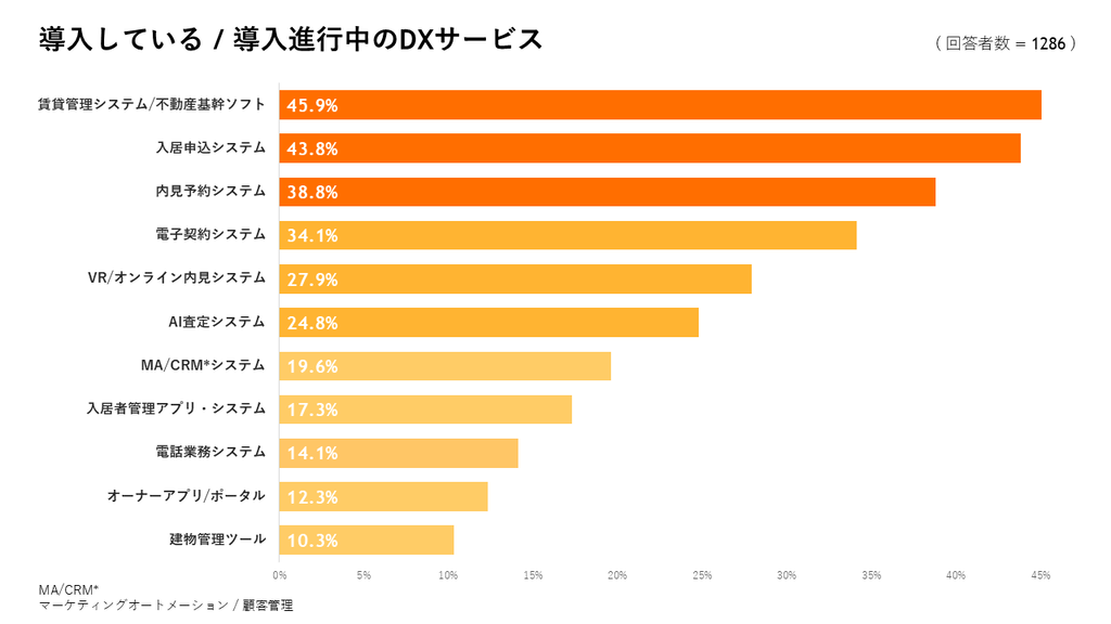現在導入中または導入進行中の不動産テックシステムについて質問したところ「賃貸管理システム/不動産基幹ソフト」が最も多く45.9%、次いで「入居申込システム」が43.8%、「内見予約システム」が38.8%、「電子契約システム」が34.1%だった。