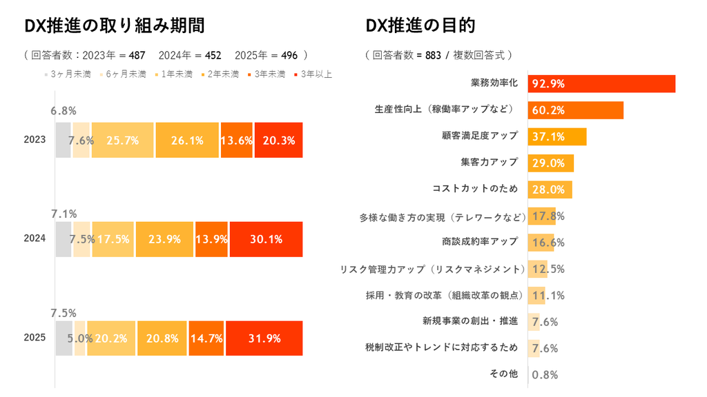 DXに取り組んでいる期間について質問したところ、「1年以上」が全体の約3分の2となる67.4%に。「3年以上」は31.9%で、DXを導入した多くの企業は継続して取り組みを続けていることが分かった。また、DX推進の目的は、「業務効率化」が最も多く92.9%で、次いで「生産性向上」が60.2%、「顧客満足度アップ」が37.1%だった。