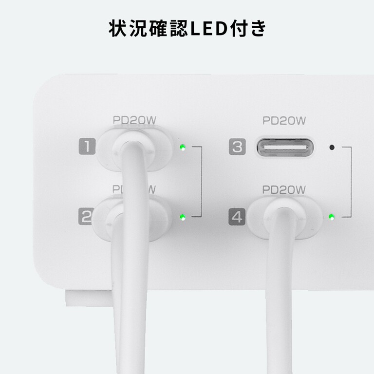 各ポートごとに充電状態が確認できる充電表示LED付き。