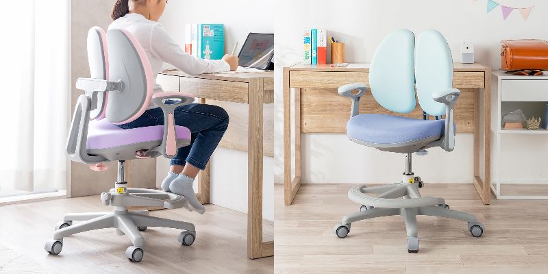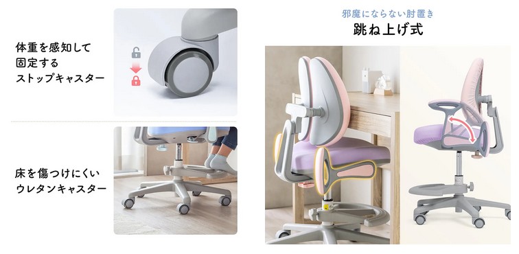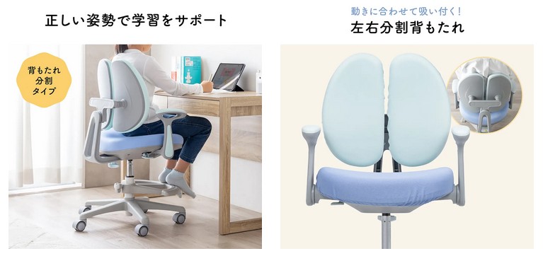 左右分割された背もたれが体の動きに合わせてフィットし、正しい姿勢を自然に保つ。学習時の猫背や前傾姿勢を防ぐことで集中力が高まり、長時間の学習や作業でも疲れにくくなる。健康的な姿勢習慣を身につけるサポートチェアだ。