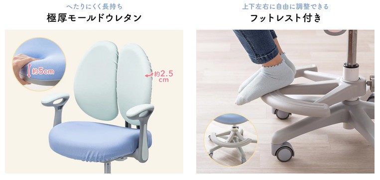 極厚モールドウレタンの座面はふかふかで耐久性にも優れ、長時間座ってもへたりにくい仕様だ。学習や在宅ワークなど、日常のあらゆるシーンで快適な座り心地を提供し、集中力と効率を高める。
