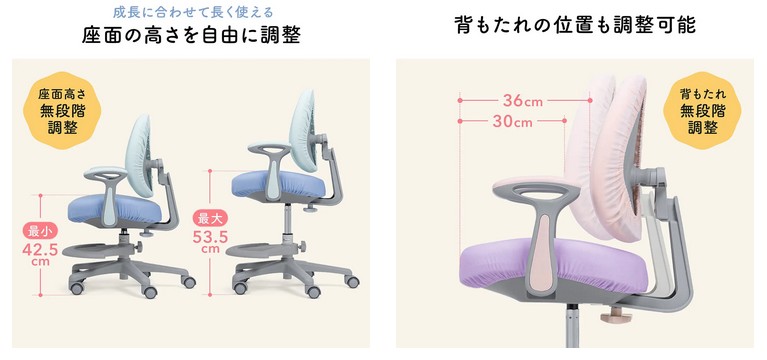 足置きの高さや背もたれの奥行きは成長に応じて調整可能。座面もガス圧昇降でラクに高さを変えられるため、子どもから大人まで長く使用できる。一度の購入で成長段階に合わせた快適な学習環境を実現する。