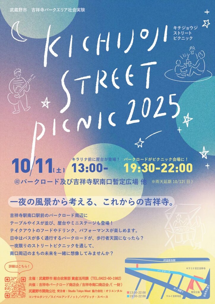 武蔵野市は、吉祥寺パークエリアの将来像づくりに向けた社会実験として、2025年10月12日(日)に「吉祥寺パークエリア社会実験 KICHIJOJI STREET PICNIC 2025」を開催する。吉祥寺駅南口のパークロードを中心に、道路空間や周辺の公共空間を活用して「誰もがふらっと立ち寄れる夜のピクニック」を実施。地元商店会・武蔵野市開発公社と連携し、にぎわいと滞在の新しい形を体験することができる。
