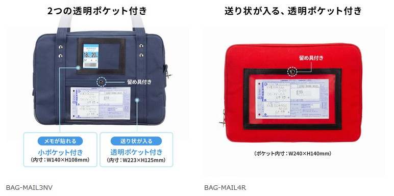 送り状専用の透明ポケット付き。送り状が飛び出ないように留め具も付いている。BAG-MAIL3NVには、メモを貼ったり入れたりできる小窓ポケットも付いているので、「送付時間帯」「至急」「取扱注意」などを表示して、配送中のミスを防止できる。