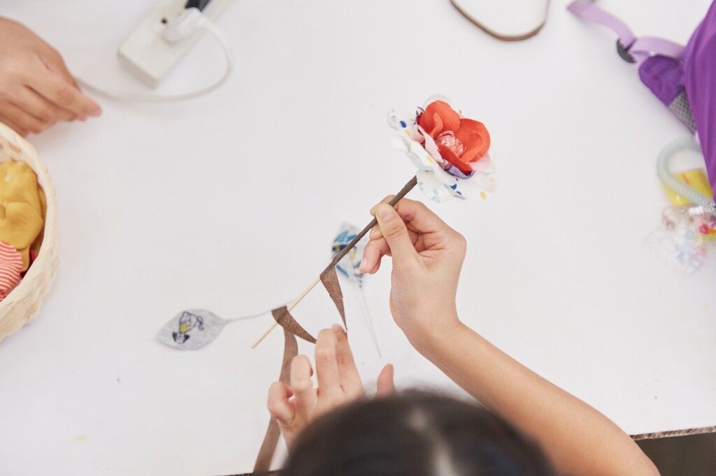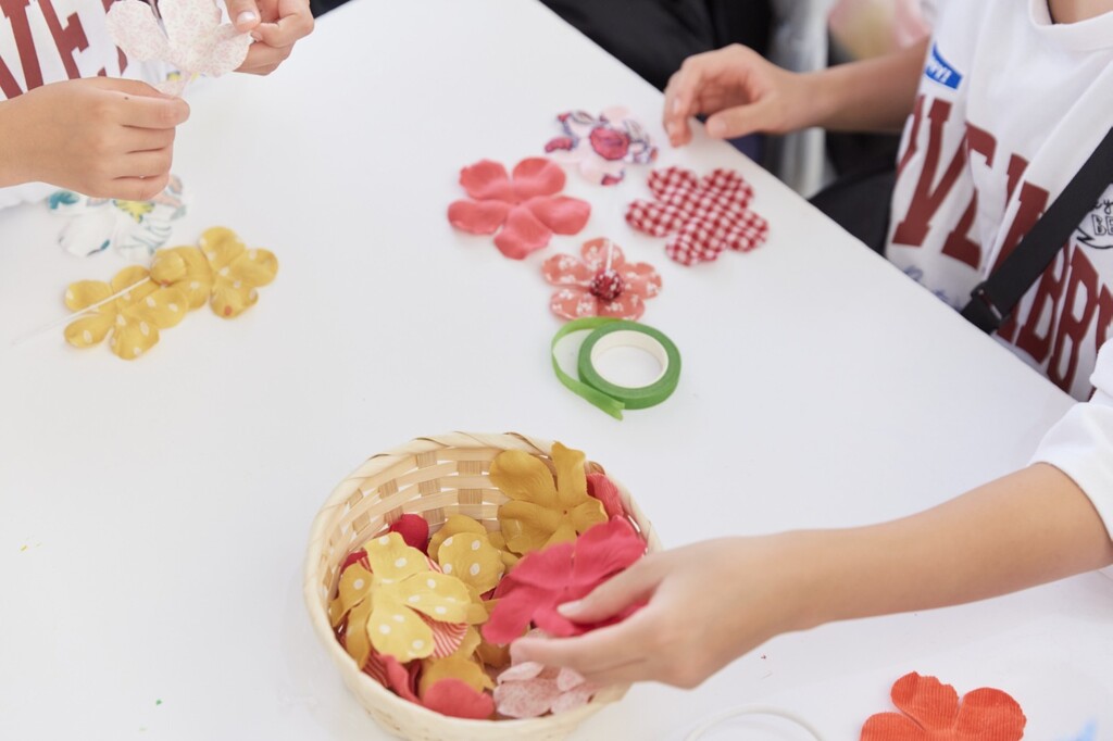 本プログラムは、規格外品や販売が難しくなった洋服や再販困難なセカンドハンド品の端切れをアップサイクルし、子どもたちが世界にひとつだけの“お花”を制作する体験型イベント。当日は4回すべてのワークショップが大盛況となり、合計で53名のお子さまが参加した。「古いものから新しいものを生み出す」体験を通して、子どもたちは“ものを大切にする心”や“つくる喜び”を感じる機会となった。