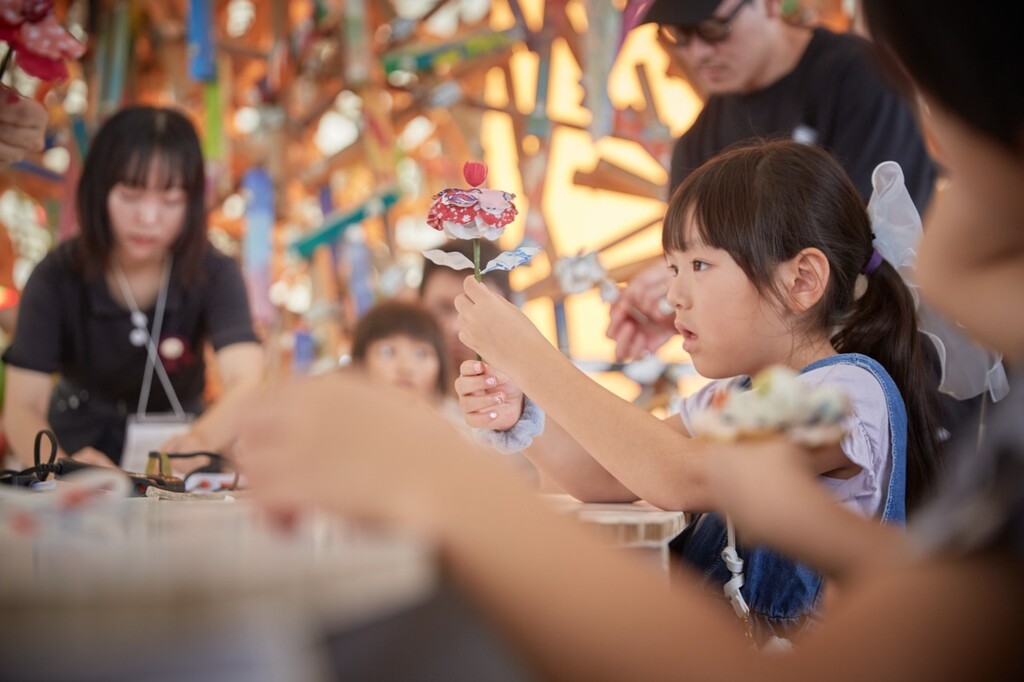 「どこに飾ろうかな〜」「こんなにきれいなお花ができたよ!」といった声があふれ、参加者の想いやセンスが詰まった花々が咲き誇りました。各回の最後には、完成したお花を集めて記念撮影。カラフルで個性豊かな花たちが並び、にぎやかな万博会場に温かな彩りを添えた。