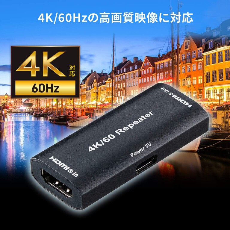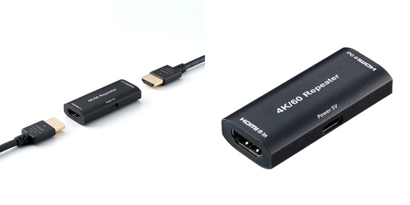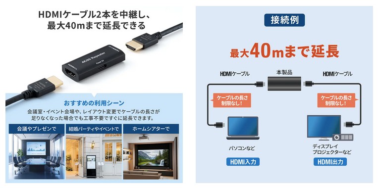 本製品は、HDMIケーブル2本を中継して最大40mまで延長できるリピーター式中継アダプタ。4K/60Hz対応で、HDRやHDCP2.2にも準拠。会議室や展示会場などの広い空間でも、映像の劣化を抑えてクリアに再生できる。高解像度映像を長距離伝送するプロユースにも対応する。
