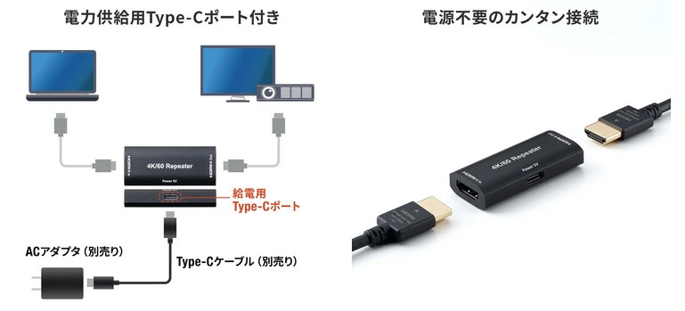 HDMI端子からのバスパワーで動作するため、ACアダプタなどの外部電源が不要。接続するだけですぐに使用できる。長距離伝送などで電力が不足する場合は、USB Type-Cポートからの給電も可能。設置環境を選ばず使用できる。